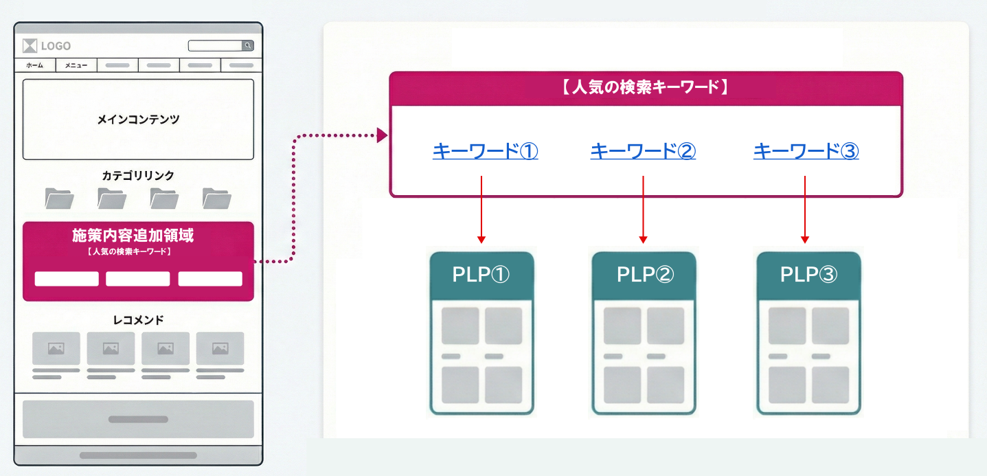 サイト内で最も高い評価を持つトップページから、PLP(優先的に検索順位を上げたいページ)へ、直接リンクをつなぎました。