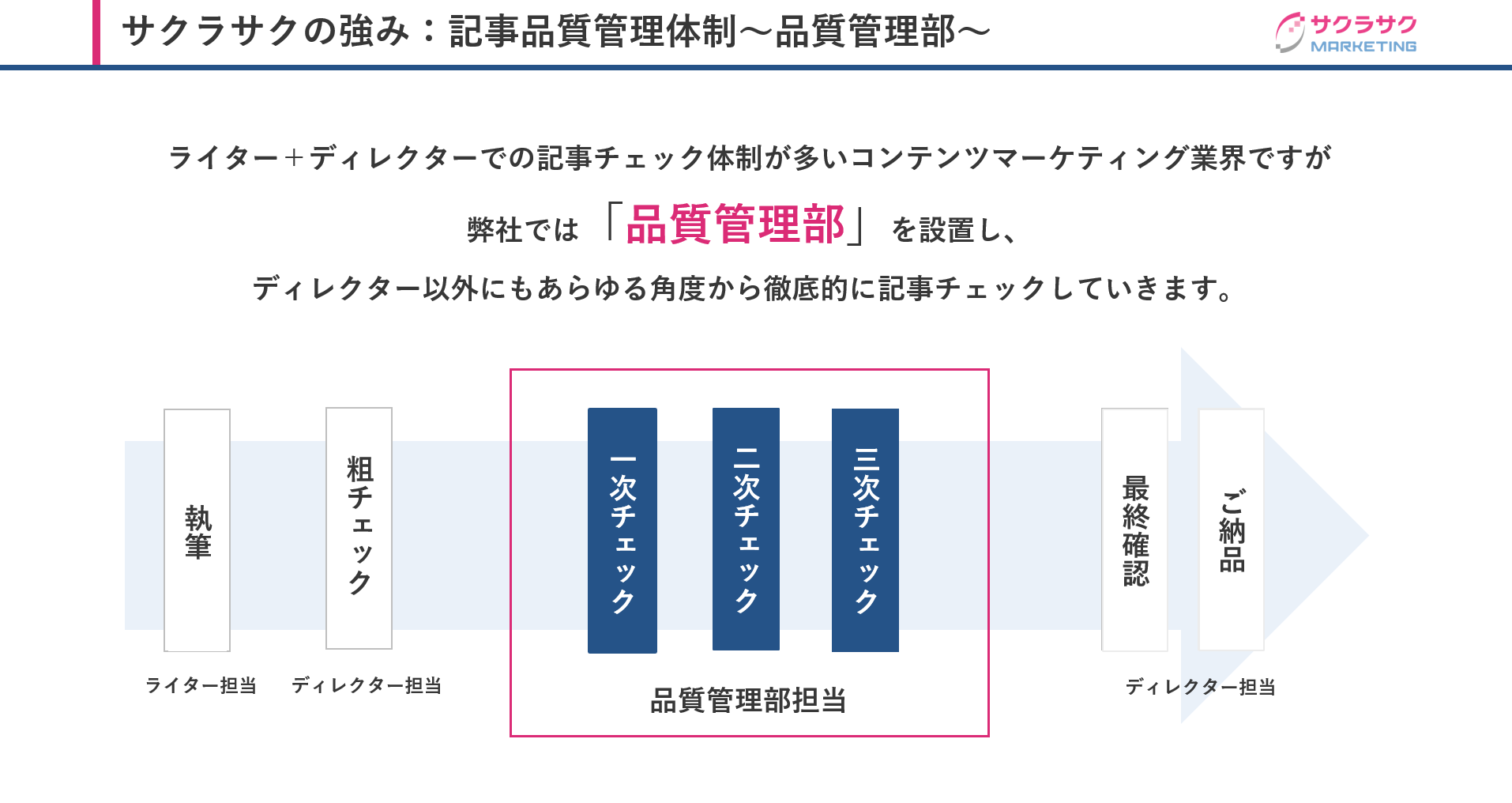 そこで弊社の場合、ヒアリングは「カスタマーサクセス部」が、構成案や記事の作成は「経験豊富なライター」が、記事の品質チェックは「品質管理部」が担当。