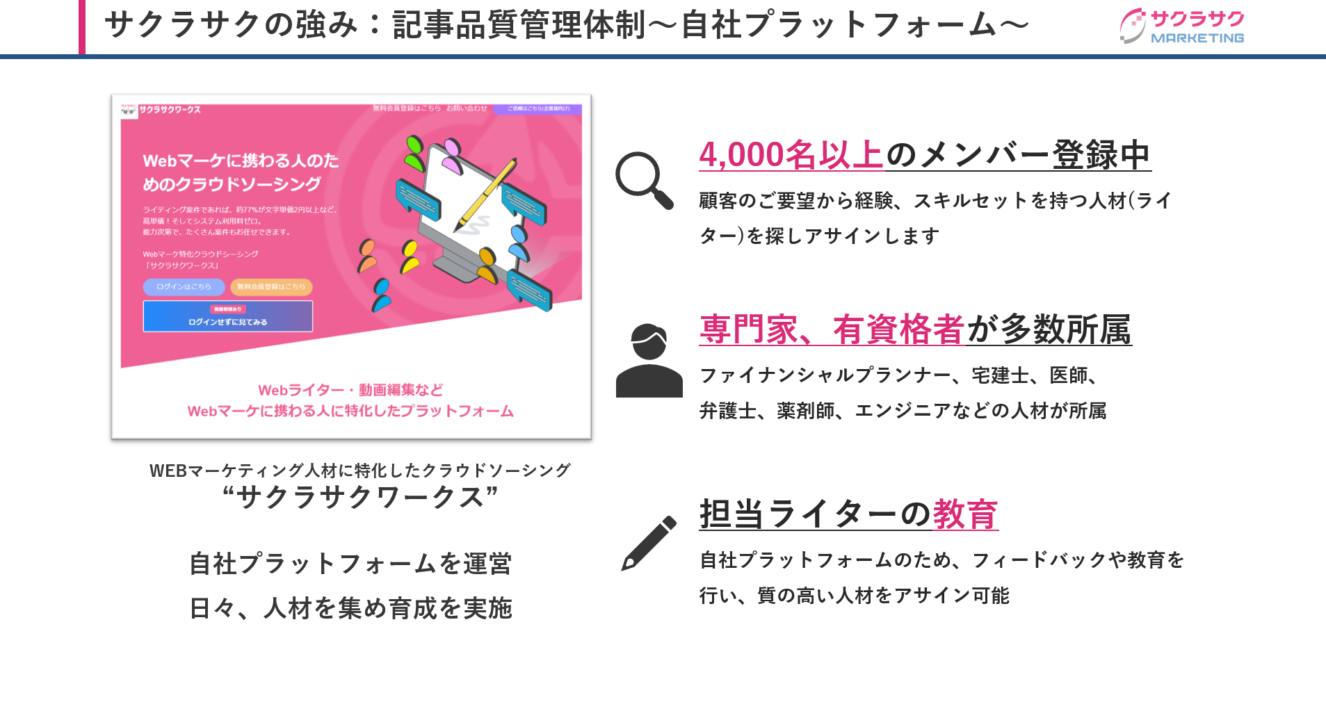 ▼4,000人以上のライターが登録する自社プラットフォーム「サクラサクワークス」