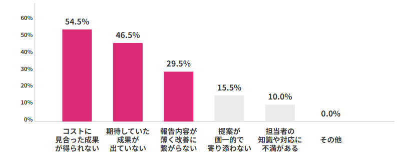 - 期待していた成果(順位、流入、CVなど)が出ていないから(46.5%)