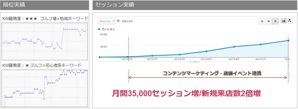 こちらは店舗サイトでのセッション数増加と、新規来店数が増加した事例です。約8記事/月のペースで読み物系コンテンツの投稿を毎月実施し、各コンテンツから店舗で実施するイベントページへ誘導しました。こちらは施策開始から7ヵ月で月間35,000セッションの増加を達成しています。