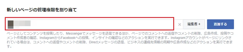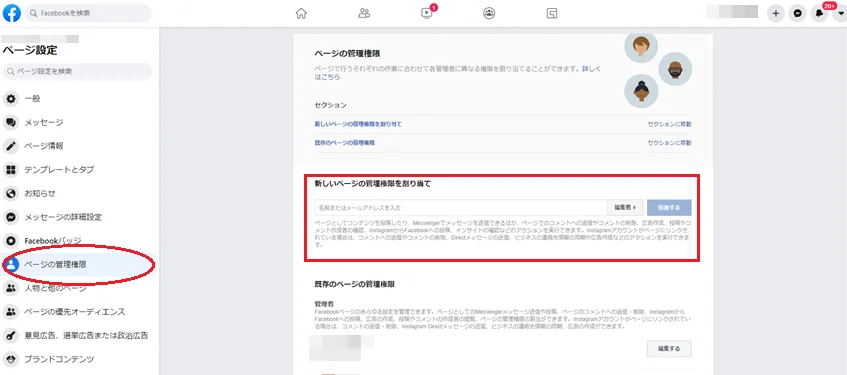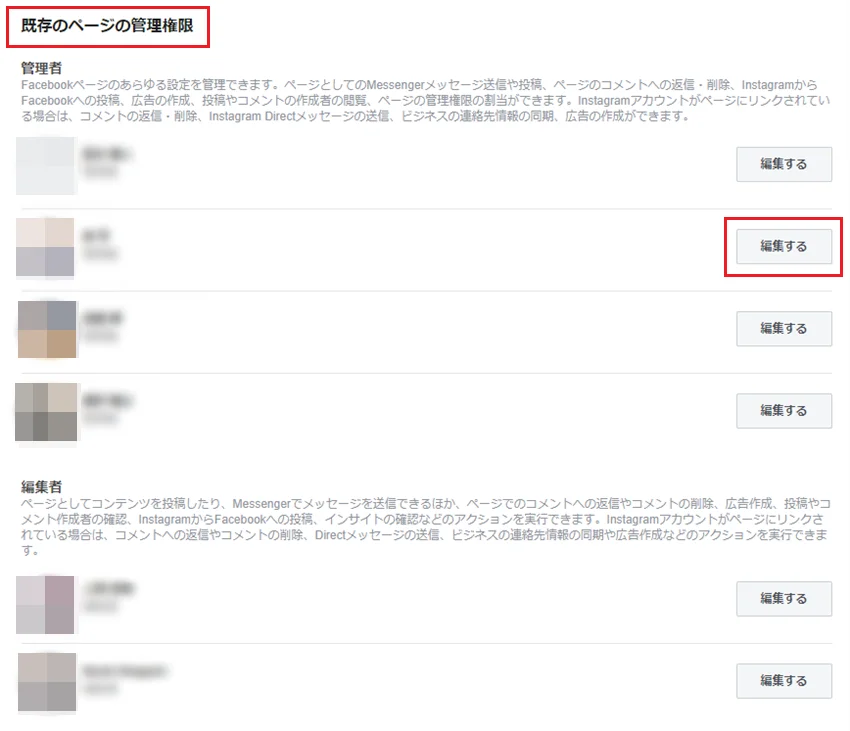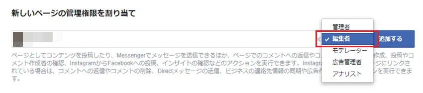 委譲先のユーザーがまだ当該Facebookページのどの役割も持っていない場合は、上述の「Facebookで管理者を追加する手順」で追加し、すでに役割(編集者など)を持っている場合は、役割を「管理者」に変更します。