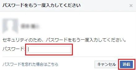 変更の完了には自身のFacebookログインパスワードの入力が必要です。