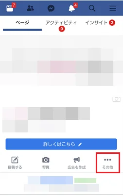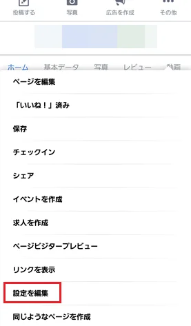 ブラウザ版であれば、Facebookページ上の「その他」をタップするとメニューが開きますので、「設定を編集」をタップします。