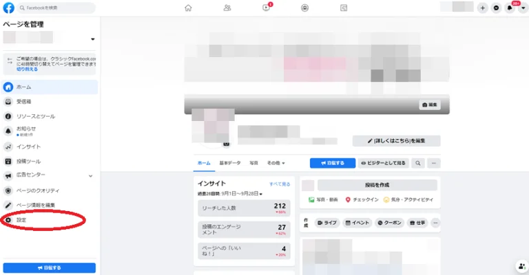Facebookページを開き、左サイドバーの1番下にある「ページ設定」をクリックします。