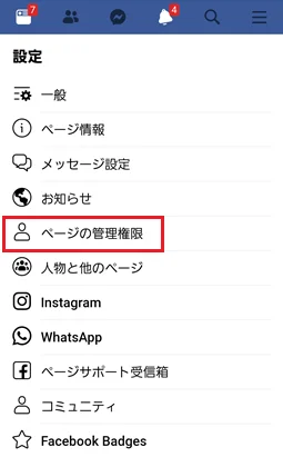 基本的には前述のPC版と同じように、管理しているFacebookページを開いて、設定から管理者追加メニューを開く手順となります。
